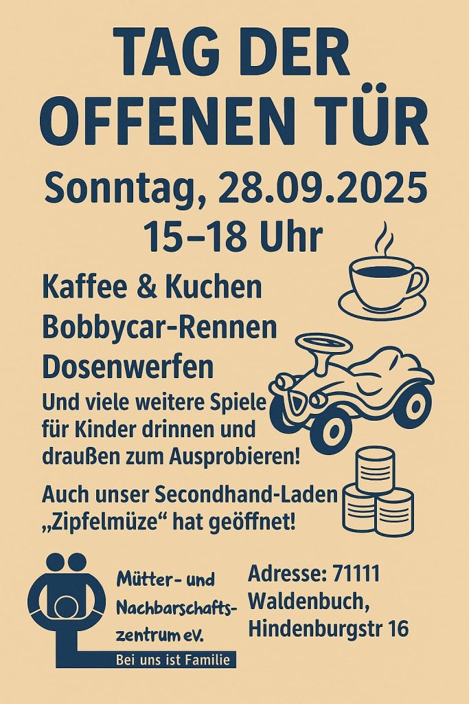 Im Zuge unserer Renovierung möchten wir euch am 28.09.25 zwischen 15 und 18Uhr unser neu eingerichtetes und neu gestaltetes Spielzimmer mit den ganzen neuen Spielsachen und Bewegungselementen zeigen. Es erwarten euch außerdem lustige Spielstationen drinnen und drausen sowie unser beliebtes Bobbycar Wettrennen. Zudem bieten wir Kaffee und Kuchen an und auch unser Secondhand-Laden, die ZipfelMüze, wird an diesem Nachmittag mit der frisch eingeräumten Herbst-und Winterware geöffnet sein! Lasst euch das nicht entgehen! Wir freuen uns auf Euch!