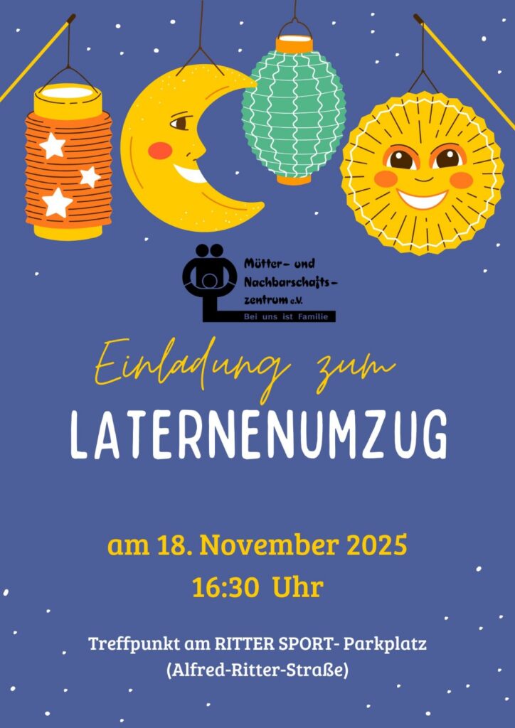 Am 15. November versammelten sich zahlreiche Kinder mit ihren Mamas vor dem MüZe zum gemeinsamen Laternenlaufen. Bei bestem Wetter ging es mit Anbruch der Dämmerung und ausgestattet mit den bunten Laternen einmal rund um die Waldorferstraße. Während dem Marsch wurde gemeinsam kräftig gesungen. Mit dem Lied „Laterne, Laterne, …“ wurde der schöne Ausflug vor dem MüZe gemeinsam beendet.